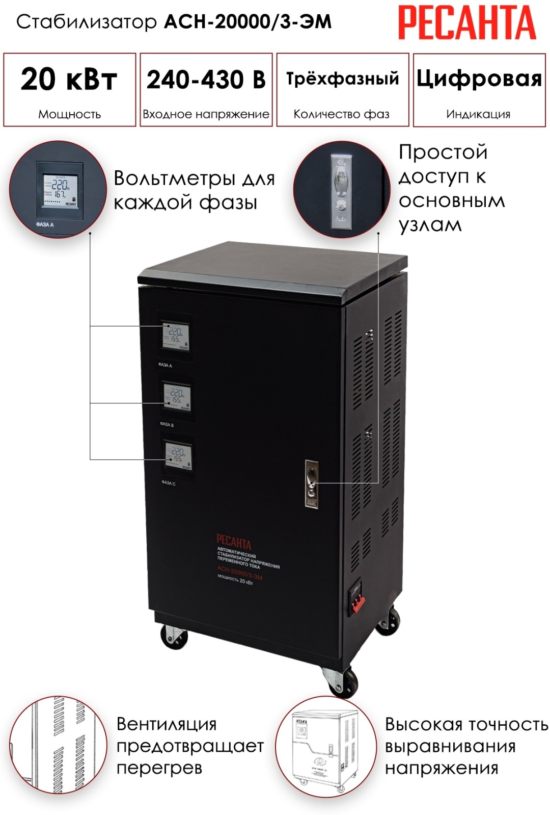 Макс. мощность – 20 000 Вт, 380В ± 2%, Электромеханический, 3-фазный, Габариты 0.455 × 0.9 × 0.505 м, Вес 78.41 кг, Артикул 63/4/6,