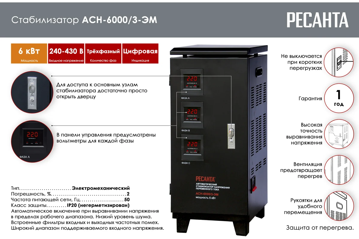Макс. мощность – 20 000 Вт, 380В ± 2%, Электромеханический, 3-фазный, Габариты 0.455 × 0.9 × 0.505 м, Вес 78.41 кг, Артикул 63/4/6,